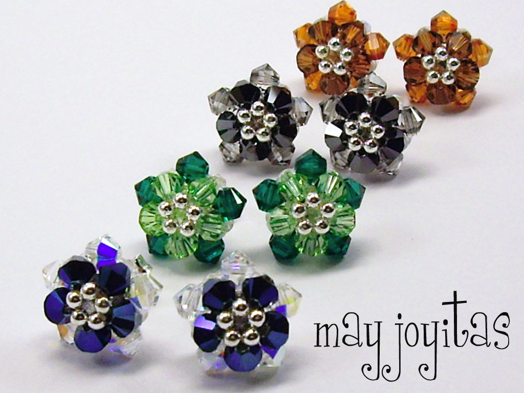 Siguiendo con el cristal swarovski os enseño estos pendientes, que son del tipo que me gustan, pequeños y "pegaditos" a la oreja, y que para las niñas gustan mucho. Los hay de dos tipos: los de una flor con cuatro pétalos y los de una flor con cinco pétalos, lo dejo a vuestra elección. Las fornituras son de plata, para que no haya problemas de alergia.